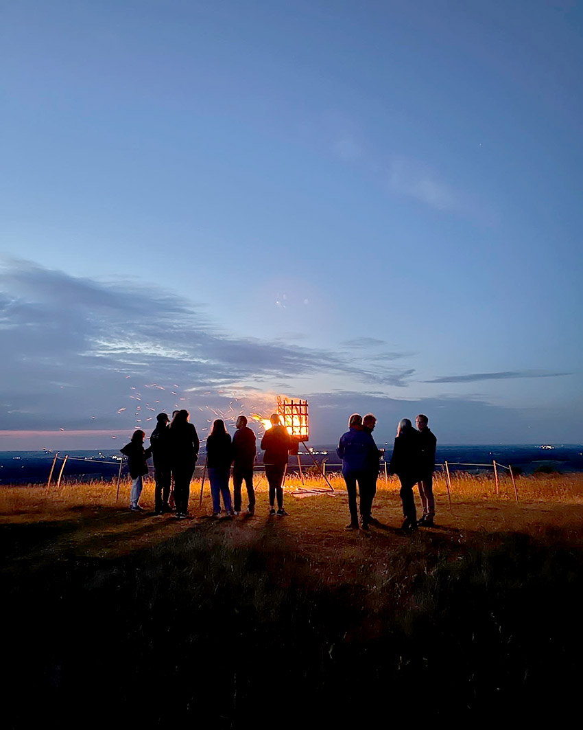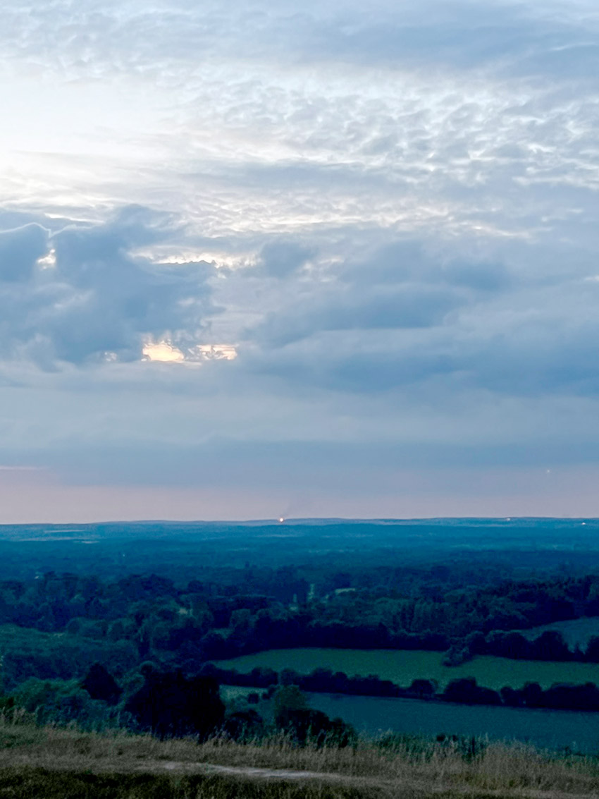 Over to the west the sun was setting in layers of red light and, because we were standing on the top of Beacon Hill, the sky seemed even more infinite. The skylarks were reminding us it was Evensong and the wild flowers embedded in the tussocked grass gave it a different feel in terms of scent and texture. Reaching out across the landscape, chequerboard fields studded with patchs of dark green trees stretch towards Oxford amongst which red brick houses turn into tiny yellow pinpricks of light as the day fades.