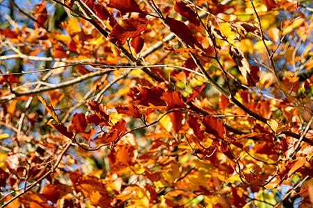 Thus the chlorophyll - the greenness - stops being produced and the carotenes in the leaf become more visible – they are yellow and the drier and sunnier the autumn, the more anthocyanins are produced, which are red and pink coloured, so the leaves turn even more shades of extraordinary colour.