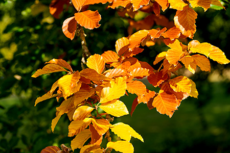 During spring and summer, trees fill their leaves with green chlorophyll in order to generate as much energy as possible. The vivid greens of spring hearten our moods as well, they are so rich and full of water and sun. Then, as summer sun lengthens, they anticipate the freezings of winter. The trees draw the energy back from the leaf into the tree to store the sugars to tide them over the coming colder, darker season.
