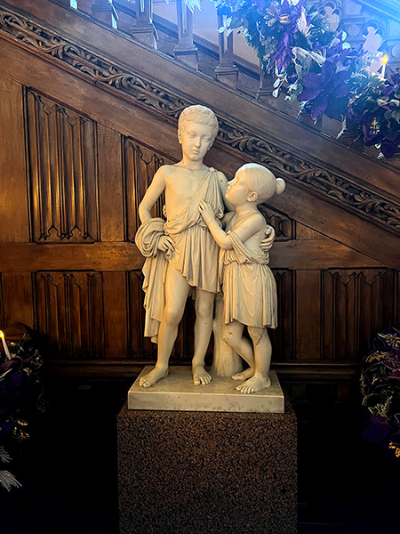Two children nestle on the landing of the main oak staircase, captured forever in translucent marble. Despite the fact that the little figures are carved from something so incredibly hard and heavy, the statue seems to reflect the light, inviting the observer almost to hold one child’s hand, to admire the perfect realism of their little toes and feet.