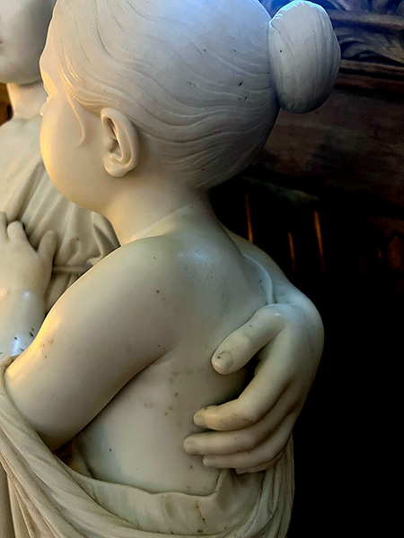 The sculptor carved them snuggled together as loving siblings, the pose reminding us of how loved they once were, cuddled and kissed by their mother. How they must have chattered and gone on adventures together but are now locked in an eternal silent pose.