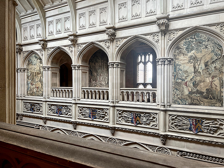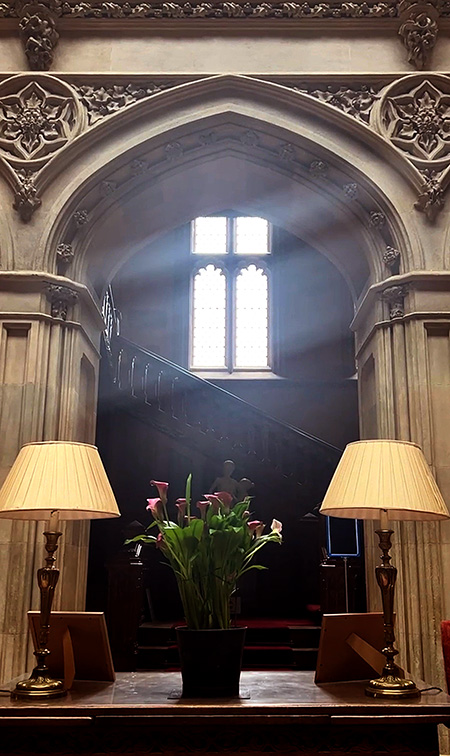 Thus at Highclere, the glazed gothic windows which filter light into the Saloon above the Oak staircase reflect a cathedral style, its church-like architecture recalling the estate’s heritage when it was originally a bishop’s palace.