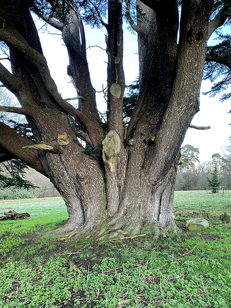 In the winter landscape, oaks and beech stand silhouetted in their bareness but the cedars offer us some colour - that lovely strong dark green. As January winds rise and fall, their branches relax and move with the gales which we have been having ample experience of over the past two weeks. Neither they nor us can fight the weather but both somehow adapt, it is about give and take.