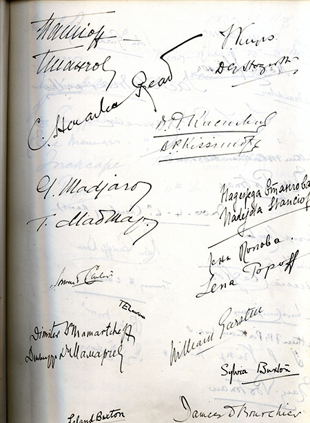 I tried to decipher some of the signatures. It must have been a reception of mostly Bulgarian diplomats. They signed in both Cyrillic and latin. One was most likely Nadejda Stancioff, Bulgaria's first woman on diplomatic service during the 1910s and 1920s, later Baronetess of Deanston. There is a picture of her in the George Grantham Bain Collection. Grantham... funny coincidence.