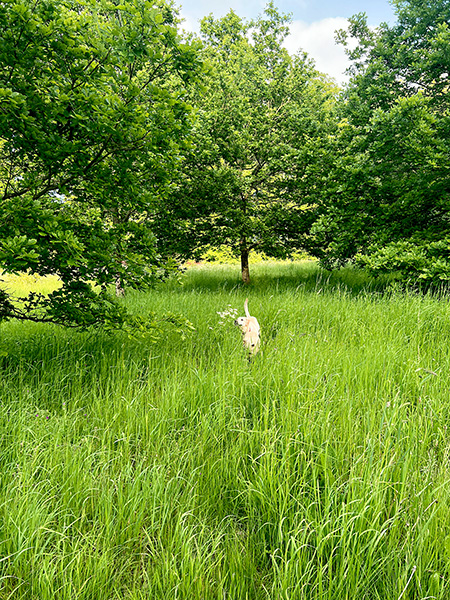 A flattish, hazel framed “wild” garden lies beside the lower left hand corner of the wildflower meadow. At this time of year a winding mown path leads into it, flanked by tall grasses and low shrubs. It is “wild” partly because we have not yet worked out a plan for this area but also because, luckily, fashion has caught up with us and although it has been so named for the last 15 years, today a wild garden is a rather modish thing to have.