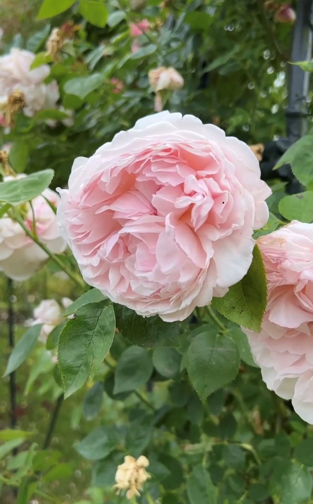 Around the Rose Arbour which connects the “Wild Garden” to the Six Sisters Walk it is full of nettles and other weeds. Again we do not have the manpower or desire to mow and manage but I have planted five orchards trees off to one side. Thus it all encourages as much insect and bird wild life as possible which then helps keep rose problems at bay.
